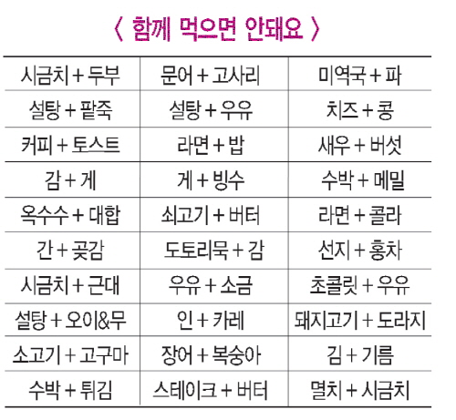 - 시금치·레몬·귤·고구마는 동시에 먹지 않고 2시간 정도 띄우기